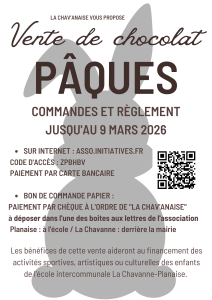 La Chav’anaise a le plaisir de vous informer qu’une vente de chocolats et friandises de Pâques est actuellement organisée au profit des enfants de l’école intercommunale La Chavanne–Planaise.